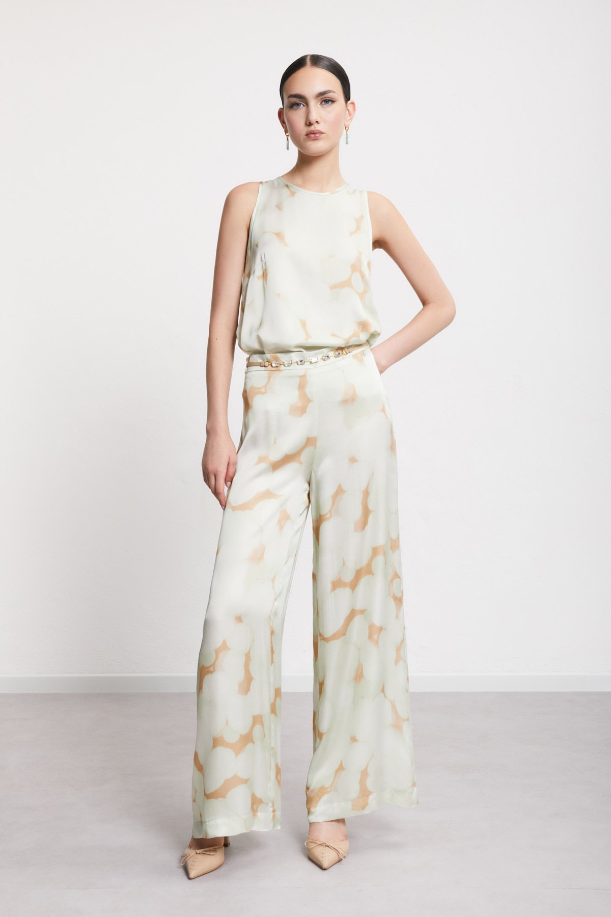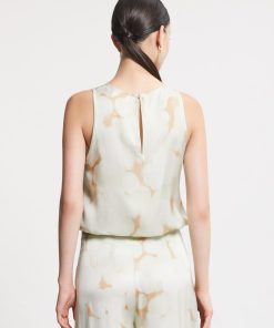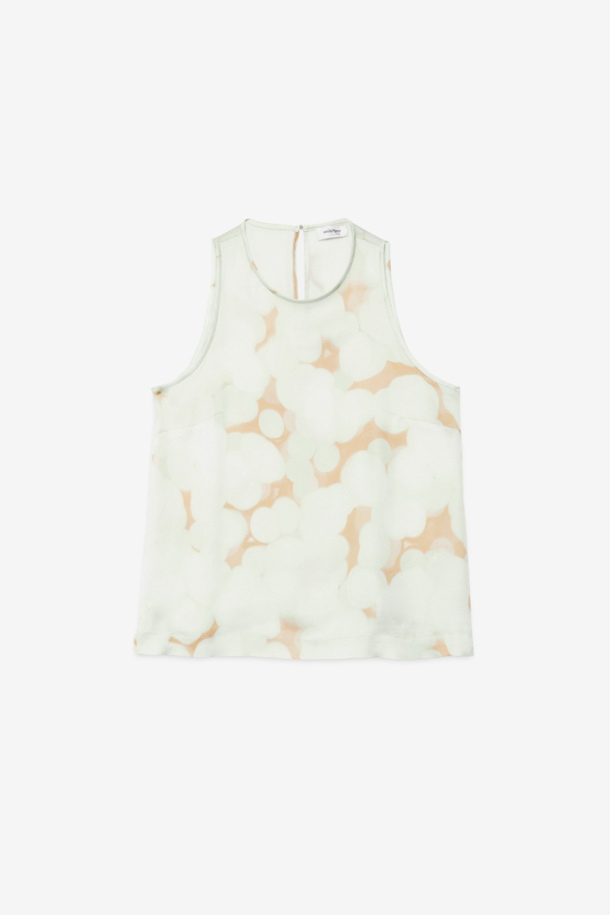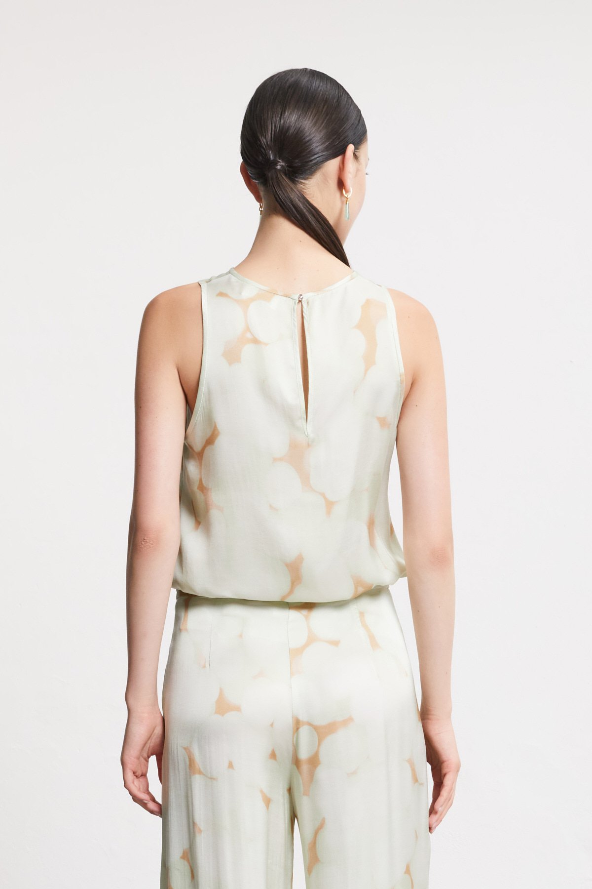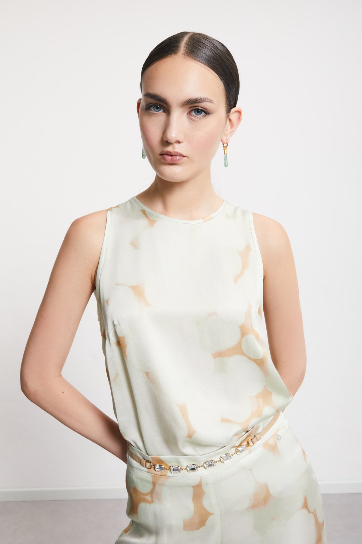 “100% Satin viscose flowy top with a print that evokes the effect of water bubbles, creating a dynamic and fluid look.”/>Printed viscose top {