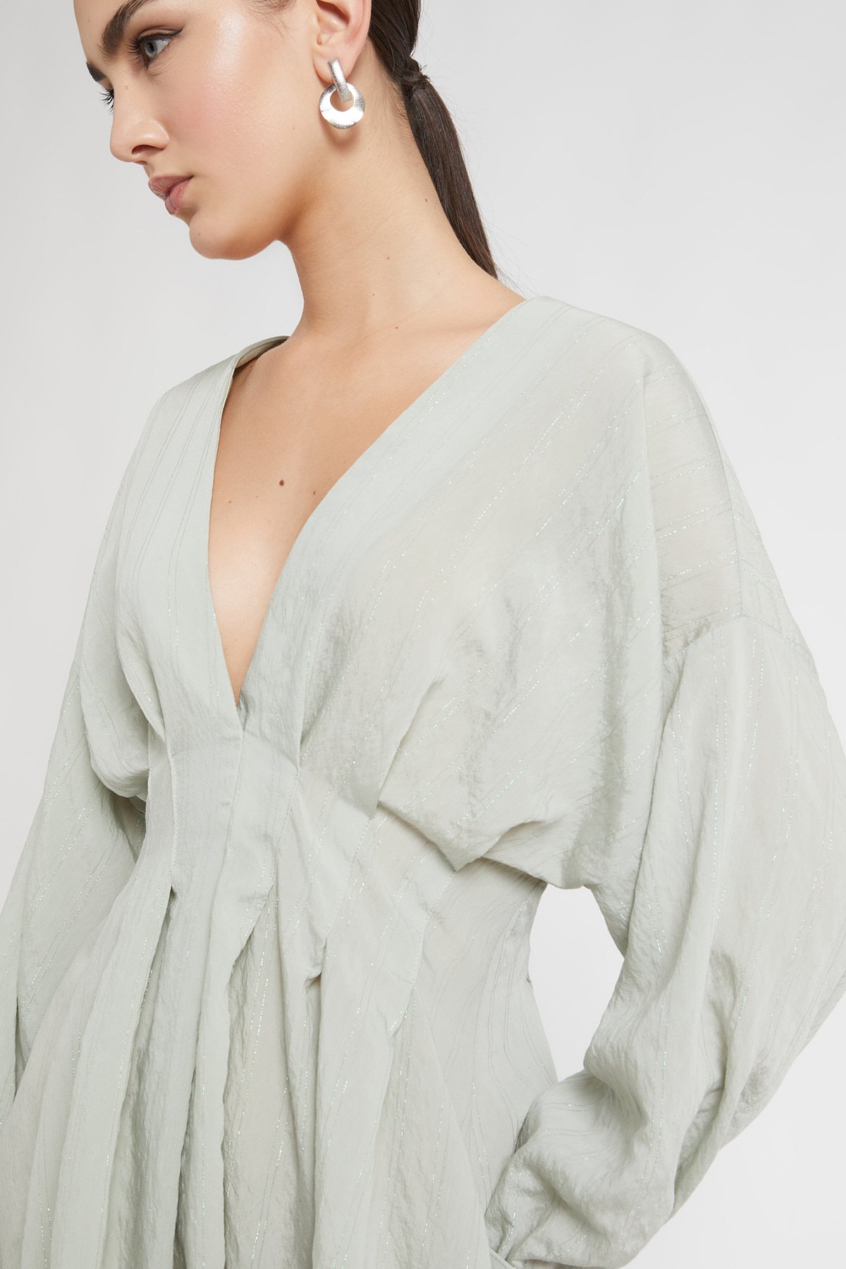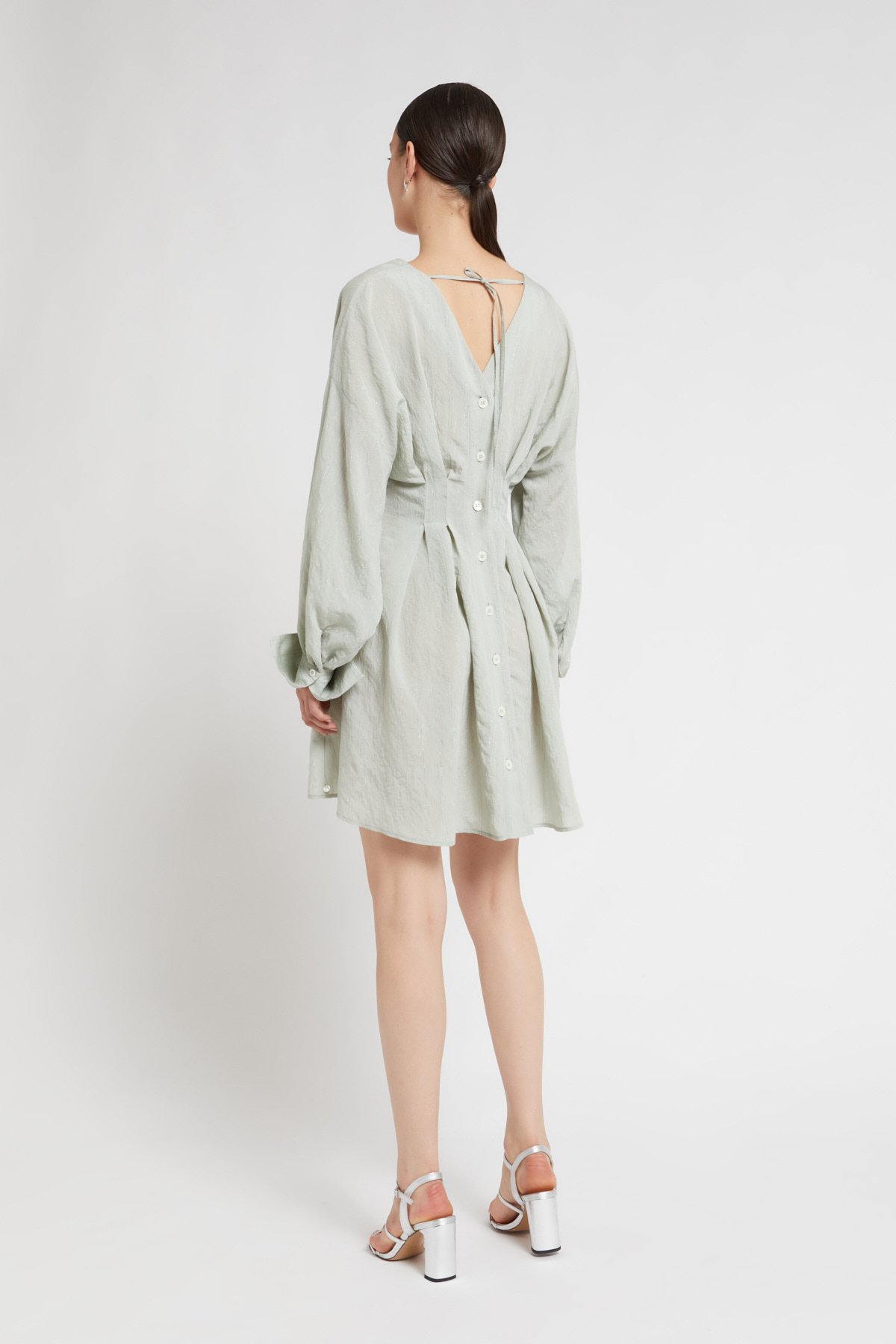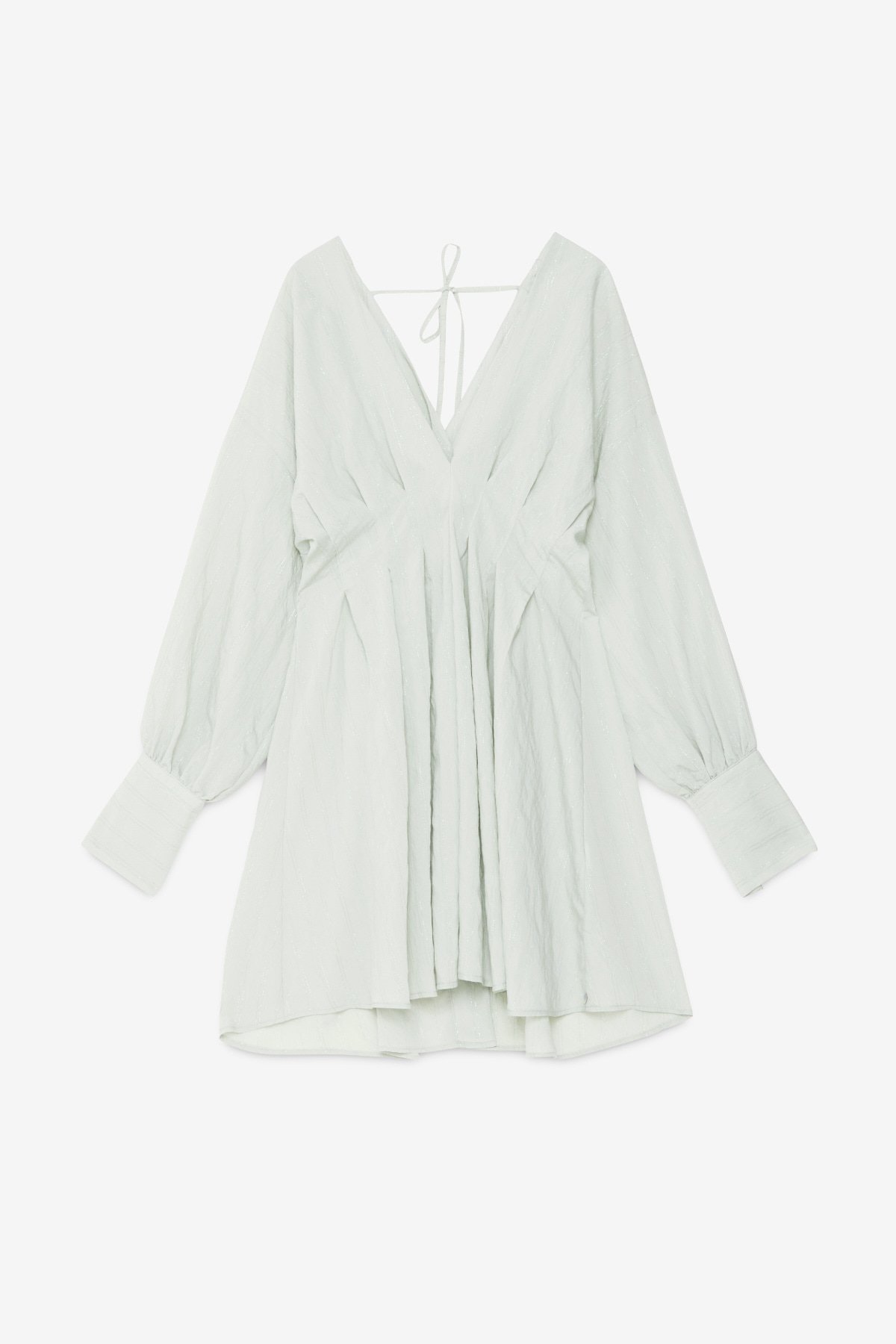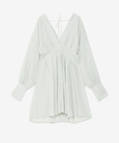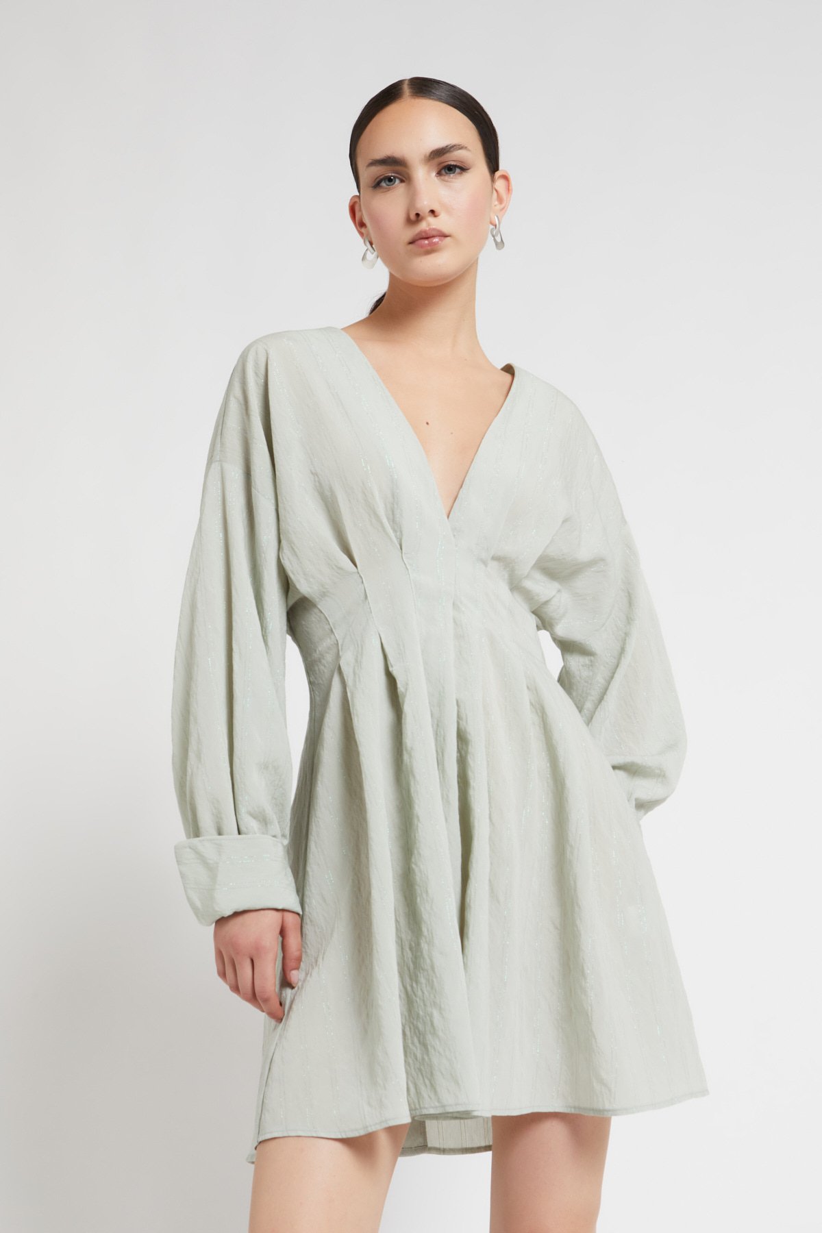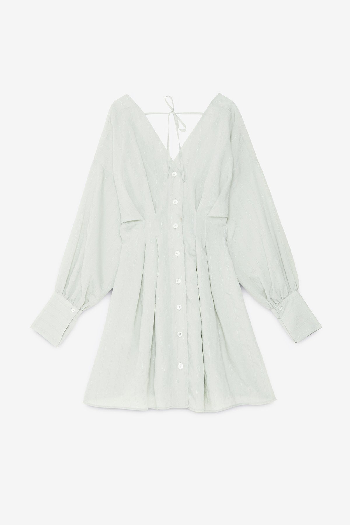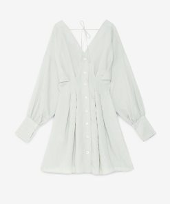 “Pinstriped viscose short dress, with lurex, buttons, pleats and V-neck.”/>Viscose short dress with buttons {